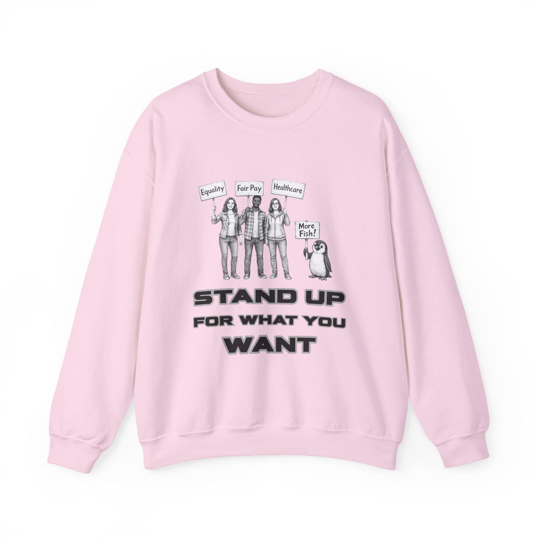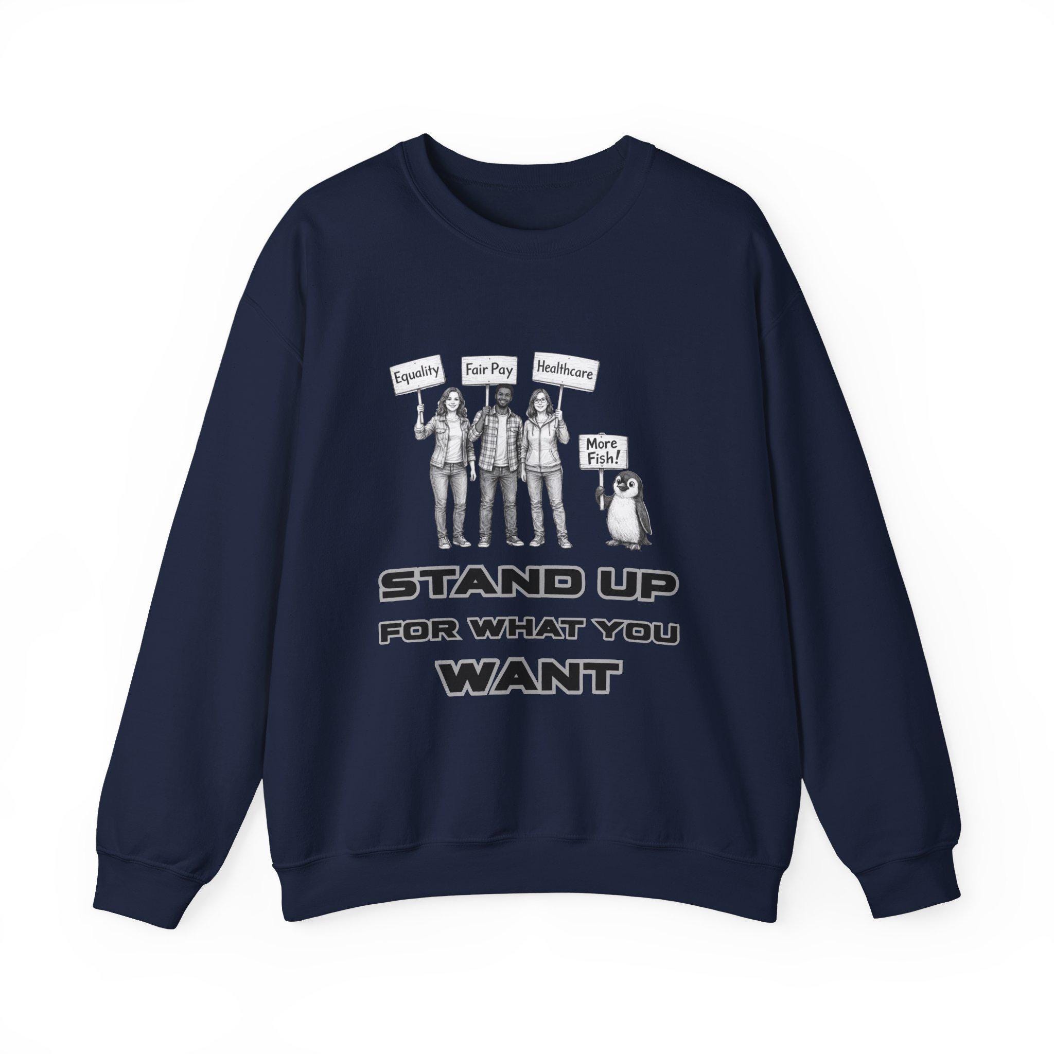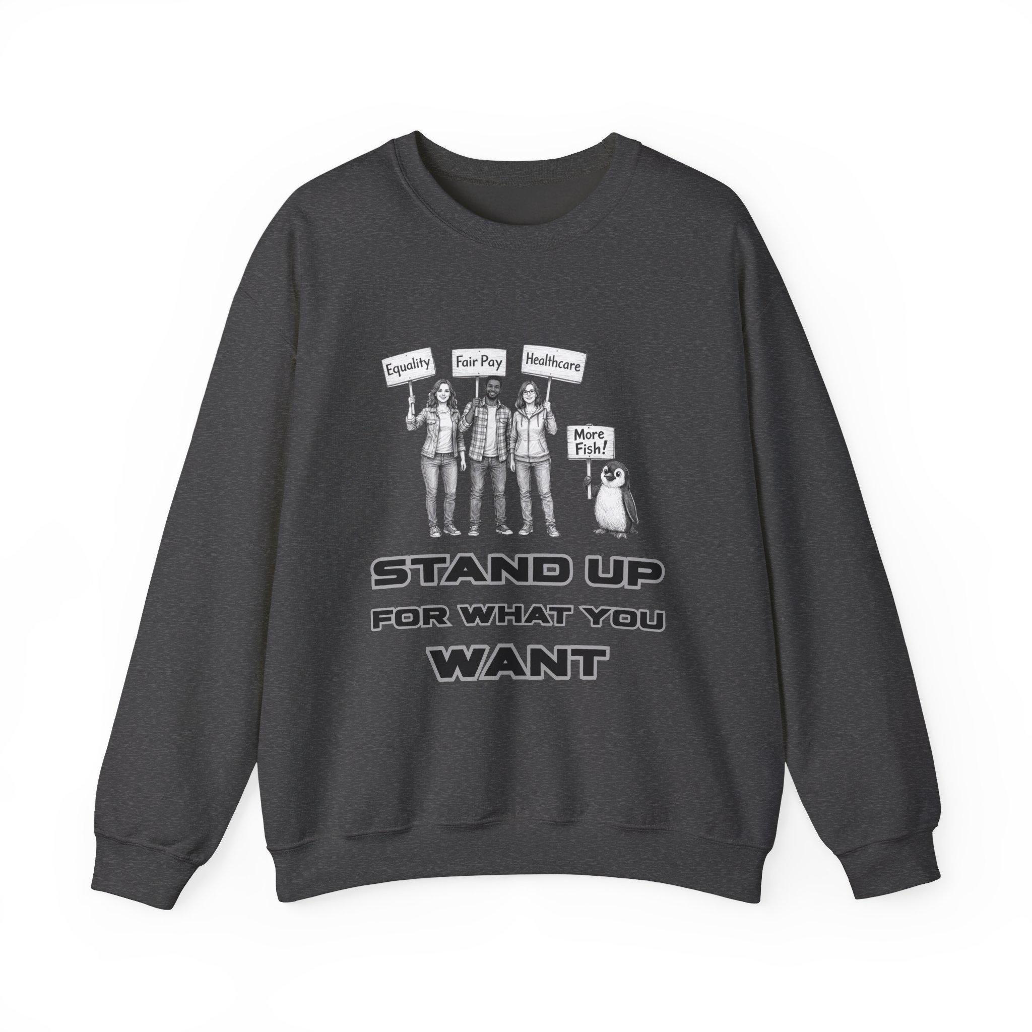This crewneck sweatshirt carries a quiet, determined energy. A clean white canvas frames a black-and-white illustration: three people holding signs — “Equality,” “Fair Pay,” “Healthcare” — beside a small penguin with a “More Fish!” sign. Below, bold block letters read: STAND UP FOR WHAT YOU WANT. Wear it when you want your values to speak before you do. The medium-heavy 50/50 cotton-poly blend feels substantial without weighing you down. The tubular knit and ribbed collar keep the silhouette neat, while double-needle stitching at stress points means this sweatshirt will hold its shape through repeated wear. Subtle details — a tear-away neck label, DTF neck and wrist prints, and optional embroidery placements — let you customize how you present your message. It’s a simple, sincere piece for people who show up for causes, community, and the small, persistent humor of a penguin demanding snacks.